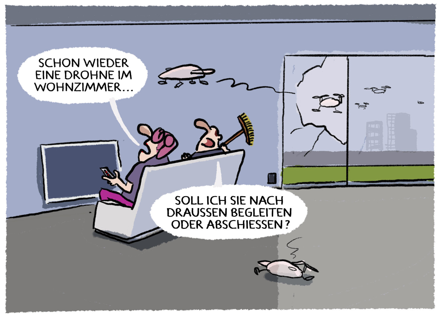 Drohnen über Polen und Dänemark – wo kommen sie her und was bedeutet das? Die Verteidigung der EU ist in Alarmbereitschaft. Karikaturist Markus Grolik greift das Thema aus einer anderen Sichtweise auf: In seiner Karikatur sind die Drohnen so etwas wie lästige Insekten, die jetzt im Herbst auch vermehrt den Schutz in Häusern und Wohnungen suchen. Da stellt sich die Frage: Abschießen oder fangen und nach draußen bringen?