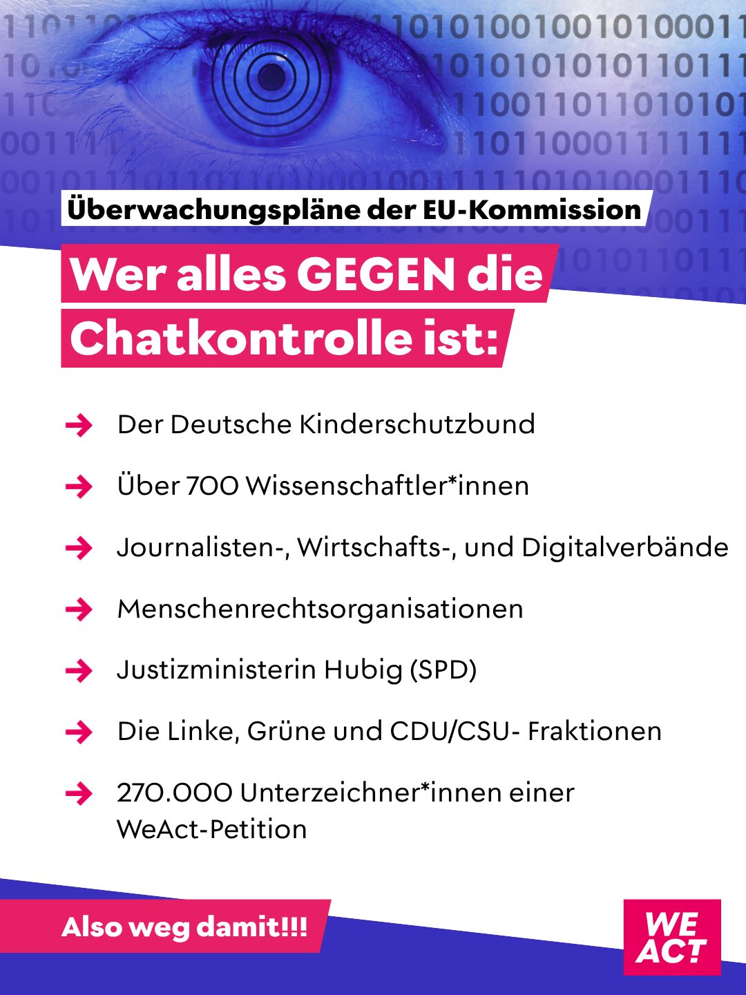 Laut der Gesellschaft für Freiheitsrechte (GFF) verfolgt das geplante EU-Gesetz zur Chatkontrolle zwar ein wichtiges Ziel: den Schutz von Kindern vor sexualisierter Gewalt. Doch die Mittel dafür greifen auch aus ihrer Sicht viel zu stark in die Grundrechte ein. Auch die GFF warnt vor einer anlasslosen Massenüberwachung. Der Entwurf wäre außerdem eine Gefahr für den Quellenschutz, verletze die anwaltliche Verschwiegenheitspflicht und ermögliche den politischen Missbrauch vertraulicher Kommunikation. Das gefährde besonders schutzbedürftige Gruppen wie Journalist*innen oder Whistleblower*innen.