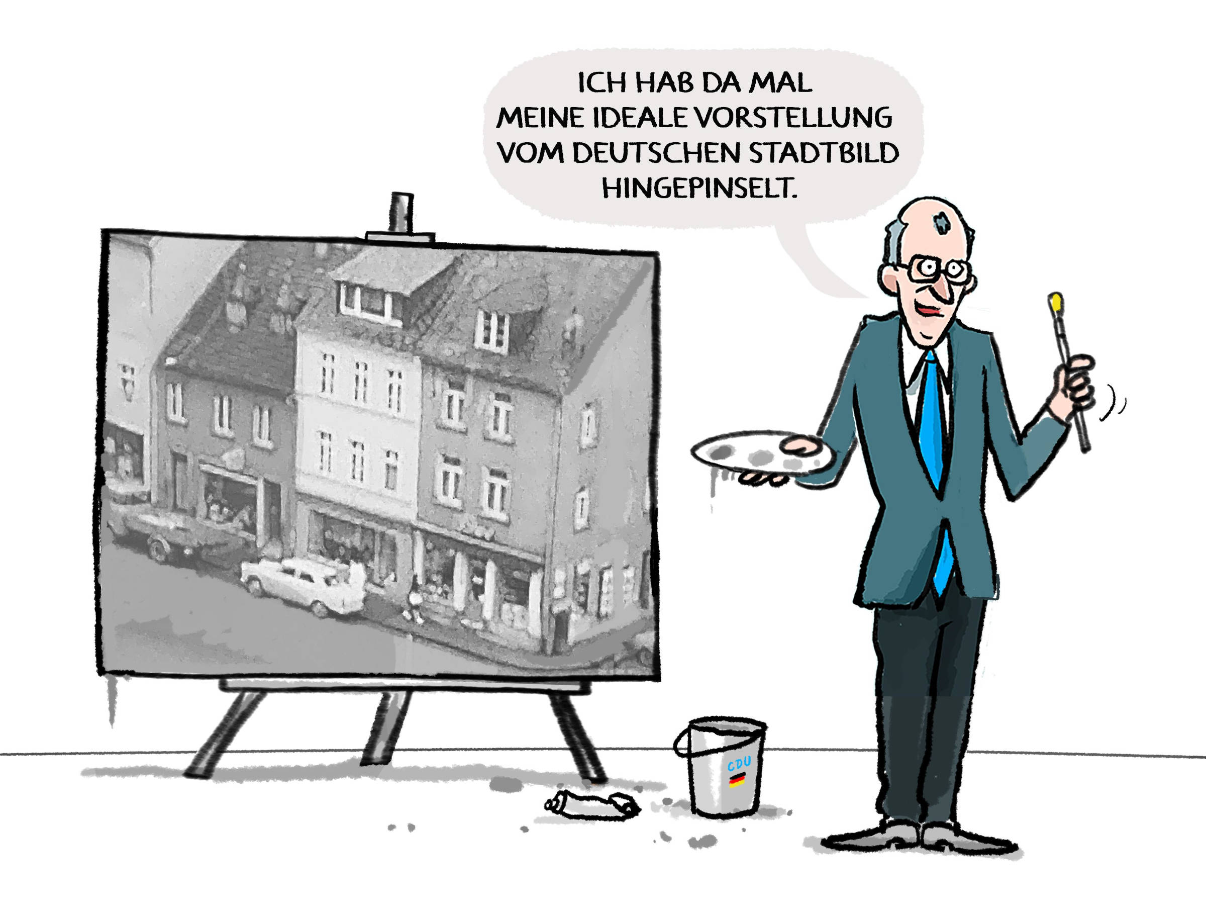 Was genau er mit dem „Problem im Stadtbild“ meint, führte er nicht weiter aus – eine gefährlich unklare Formulierung, die Platz für allerlei Interpretationen lässt. Insbesondere auch, weil sie im Kontext der Migrationsdebatte fiel. Meint er damit Geflüchtete? Menschen mit Migrationsgeschichte? Menschen, die einfach nur „anders aussehen“? Oder hätte er lieber wieder ein Stadtbild wie im Sauerland der 70er-Jahre, wie es Pro Asyl-Geschäftsführer Karl Kopp formuliert und Karikaturist Markus Grolik in seiner Karikatur zeigt?