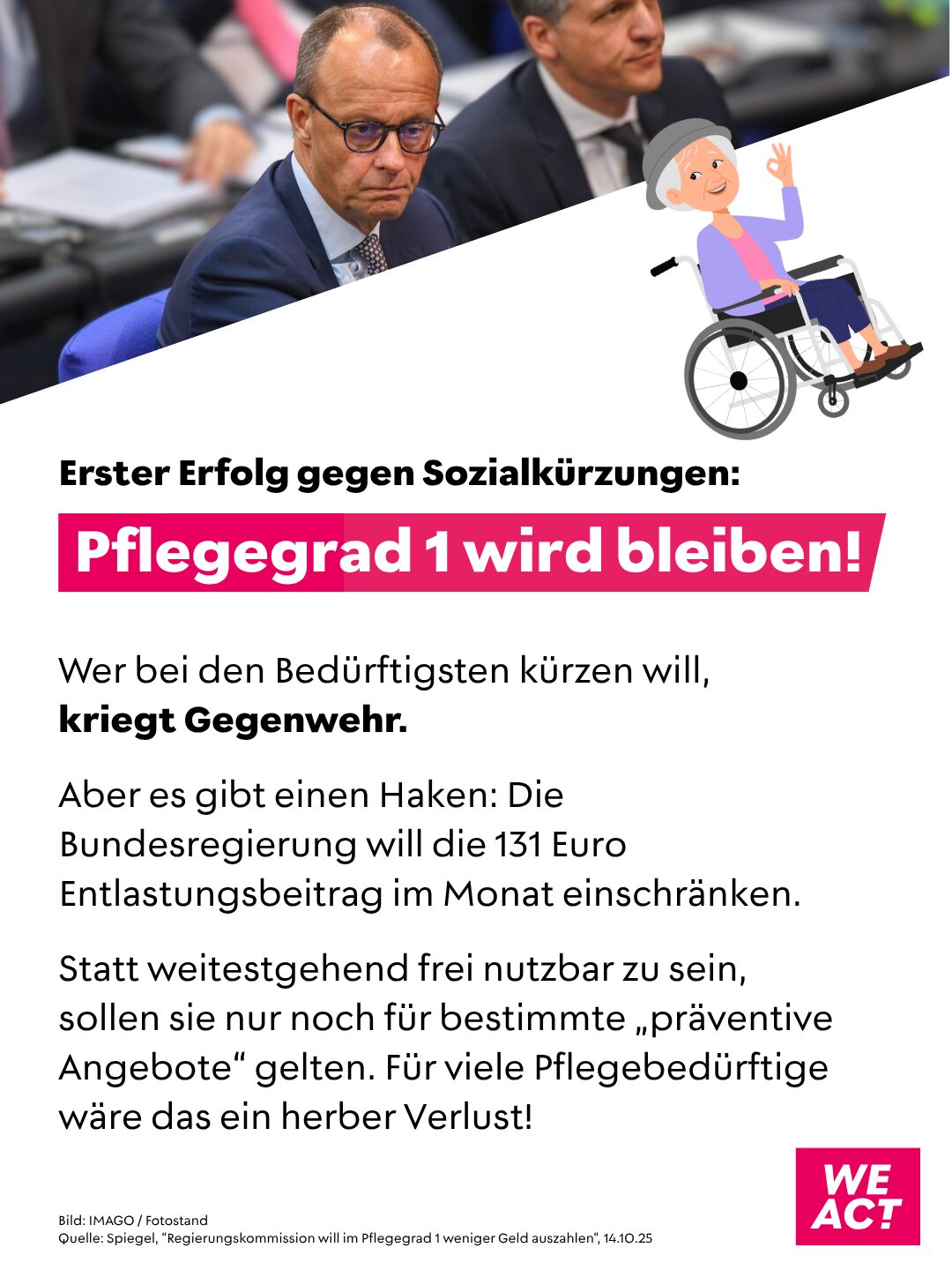 Deshalb startete die Frankfurterin auf WeAct, der Petitionsplattform von Campact, eine Petition. Ihr Ziel: Erhalt des Pflegegrads 1 für alle Angehörigen und Pflegenden! Über 220.000 Menschen unterstützten sie innerhalb weniger Tage. Der enorme Zuspruch zeigt: An der Pflege darf nicht gespart werden.