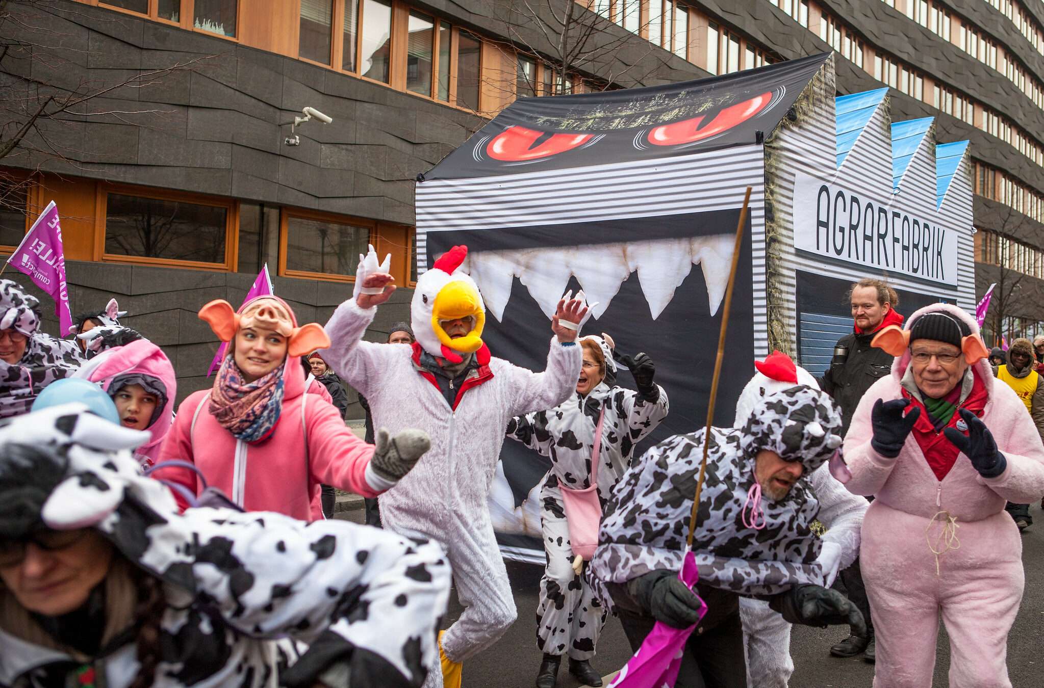 Auf einem großen Protestwagen ziehen drei riesige Tierfiguren durch Berlin zu Rainers Ministerium – jede über drei Meter hoch: eine empörte Kuh, ein wütendes Schwein, ein aufgebrachtes Huhn. Alle strecken Schilder in die Höhe: „Bessere Haltung!“ – „Mehr Platz!“ – „Faire Preise!“